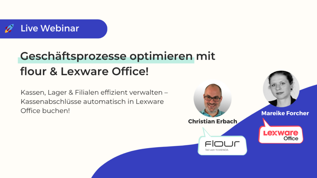 In diesem Webinar zeigen wir Ihnen, wie Sie mit der nahtlosen Schnittstelle zwischen flour und Lexware Office Ihre Geschäftsprozesse optimieren. Verwalten Sie Ihre Kassen, Lager und Filialen effizient und übertragen Sie Kassenabschlüsse automatisch an Ihr Lexware Office Kassenbuch – für eine einfache und präzise Buchhaltung.