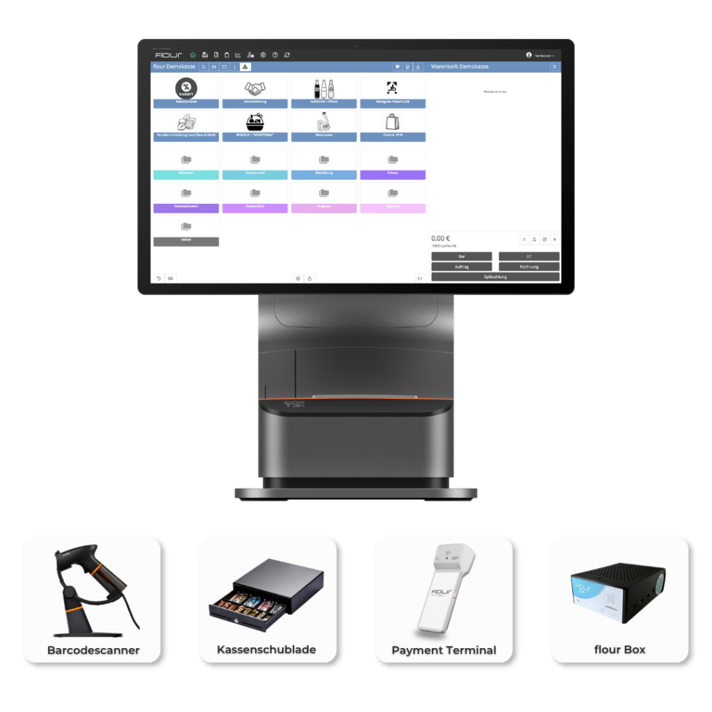 Kassenzubehör: Barcodescanner, Kassenschublade und flour Box inklusive